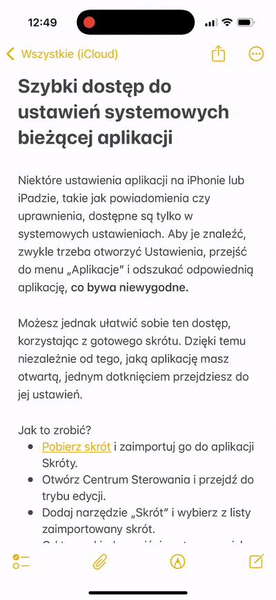 Niektóre ustawienia aplikacji na iPhonie lub iPadzie, takie jak powiadomienia czy uprawnienia, dostępne są tylko w systemowych Ustawieniach. Aby je znaleźć, zwykle trzeba otworzyć aplikację Ustawienia, przejść do menu „Aplikacje” i odszukać odpowiednią pozycję, co bywa niewygodne. Możesz jednak ułatwić sobie ten dostęp, korzystając z gotowego skrótu. Dzięki temu niezależnie od tego, jaką aplikację masz otwartą, jednym dotknięciem przejdziesz do jej ustawień.